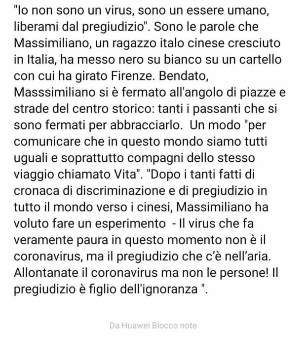 Forse, il virus che dovrebbe fare davvero paura in questo momento non è il #coronavirus, ma il #pregiudizio che c’è nell’aria. Ecco una bella iniziativa contro la #discriminazione della #UGIC (Unione Giovani Italo Cinesi)