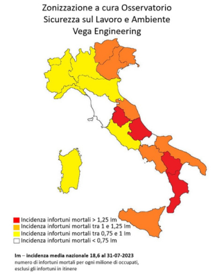 SUL PODIO DELL’INSICUREZZA IN ZONA ROSSA CI SONO: UMBRIA, ABRUZZO, BASILICATA E CALABRIA. QUESTA È LA PRIMA ISTANTANEA DELLA MAPPATURA DELL’EMERGENZA DELL’OSSERVATORIO VEGA ENGINEERING CHE AIUTA A CAPIRE DOVE I LAVORATORI HANNO RISCHIATO MAGGIORMENTE LA PROPRIA VITA DA GENNAIO A LUGLIO 2023.