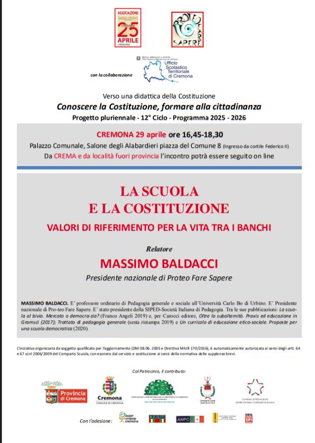 Relatore MASSIMO BALDACCI Presidente nazionale di Proteo Fare Sapere CREMONA 29 aprile ore 16,45-18,30