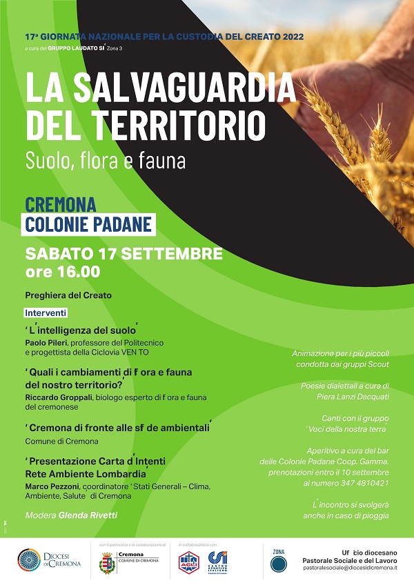 Sabato 17 settembre ore 16 alle Colonie Padane di Cremona iniziativa pubblica a cura del gruppo Laudato Sì zona 3 per la salvaguardia del territorio in occasione della Giornata nazionale per la Custodia del Creato. Partecipano tra gli altri Paolo Pileri e Riccardo Groppali.