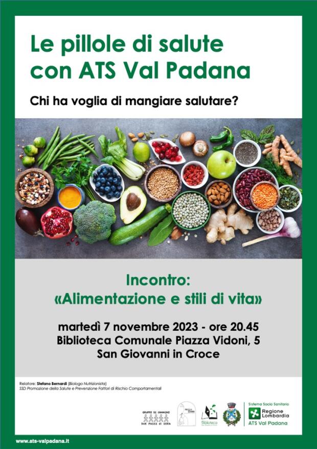 San Giovanni in Croce L’ATS della Val Padana promuove l’appuntamento “Pillole di Salute - Alimentazione e stili di vita” che si terrà il 7 Novembre presso la Biblioteca comunale – Piazza Vidoni n. 5 a San Giovanni in Croce alle ore 20:45. L’incontro sarà tenuto dal Biologo Nutrizionista Stefano Bernardi di ATS della Val Padana.