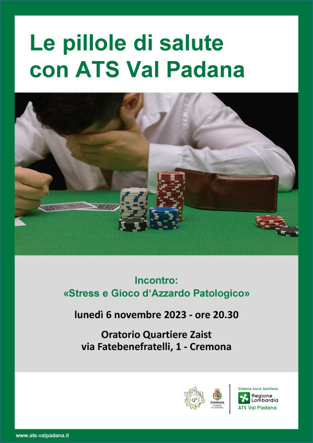 Cremoona L’ATS della Val Padana promuove l’appuntamento “Pillole di Salute – Stress e Gioco d’Azzardo Patologico” che si terrà il 6 novembre presso l’Oratorio del Quartiere Zaist in via Fatebenefratelli n. 1 a Cremona alle ore 20:30. L’incontro sarà tenuto da Elena Lameri Assistente Sanitaria di ATS della Val Padana