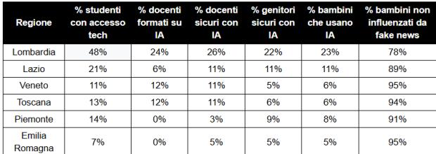 Il divario si acuisce in altre regioni: in Campania e Lazio, rispettivamente solo il 20 e 21% degli studenti ha accesso alla tecnologia e la formazione del corpo docente sull’IA resta limitata (18% in Campania, appena 6% nel Lazio).