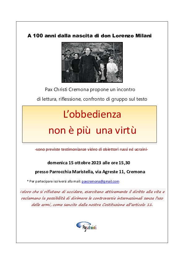 Domenica 15 ottobre alle ore 15,30 presso la Parrocchia Maristella di Cremona Pax Christi -imitando lo stile della scuola di Barbiana “dal basso e dando la parola alla gente”- propone un laboratorio per riflettere e confrontarsi insieme, sui temi centrali de “l’Obbedienza non è più una virtù” che rivendica il primato della coscienza sulla legge quando questa è ingiusta verso i poveri o induce ad azioni criminali come la guerra.