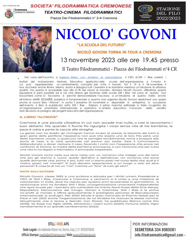 NICOLÒ GOVONI TORNA IN TOUR A CREMONA