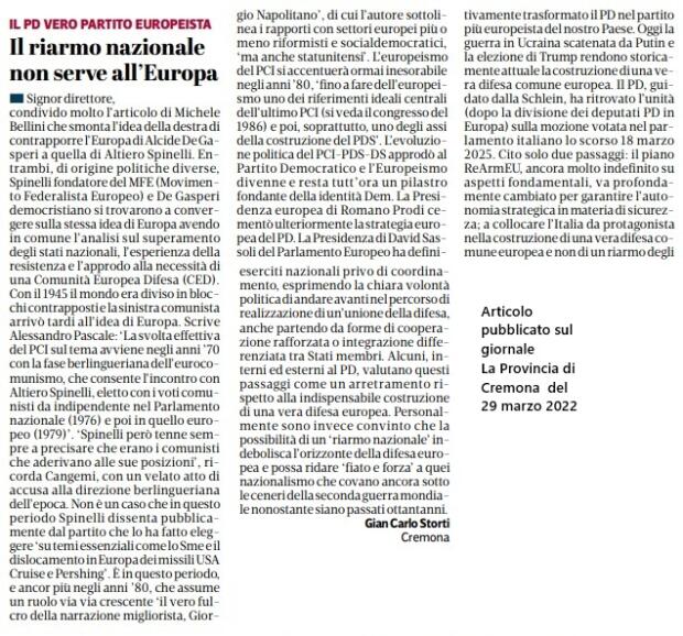 Condivido molto l’articolo di Michele Bellini che smonta l’idea della destra di contrapporre l’Europa di Alcide De Gasperi a quella di Altiero Spinelli.