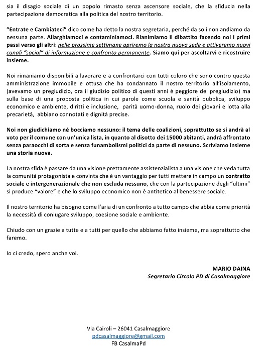 Elezoni 2024 “che Casalmaggiore vogliamo e che Casalmaggiore possiamo avere”: ridare una speranza di cambiamento per uscire dall'isolamento