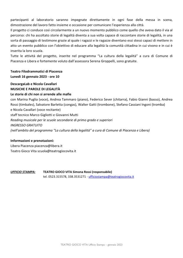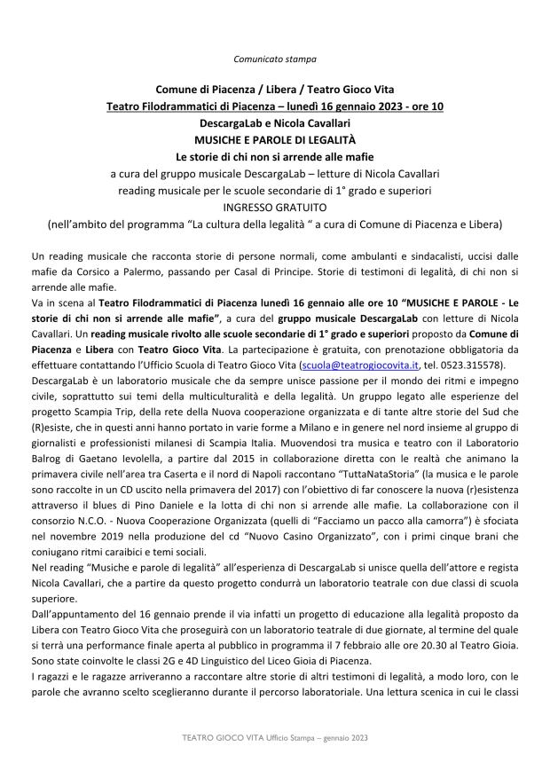Teatro Filodrammatici di Piacenza – lunedì 16 gennaio 2023 - ore 10