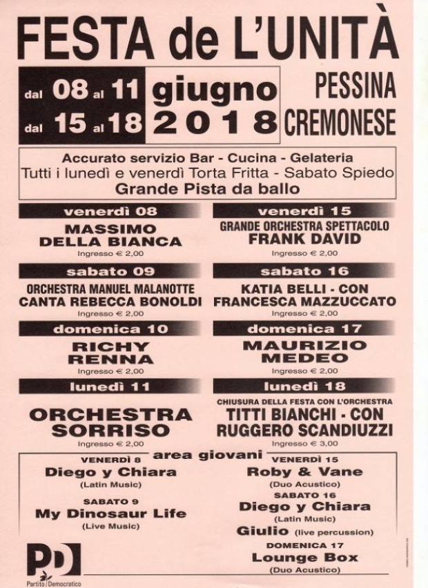 Per il PD Cremona il prossimo week-end due appuntamenti importanti .Continua la Festa dell’Unità a Pessina Cremonese dal 15 al 18 giugno e si apre , da giovedì 14 a lunedì 18 la festa dell’Unità di Pianengo