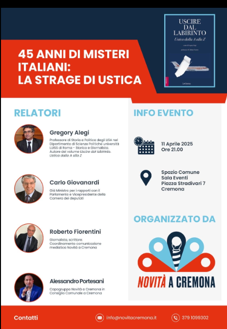 “Con l’iniziativa : 45 anni di misteri italiani: la strage di Ustica, la lista civica ‘Novità a Cremona’ – spiega Alessandro Portesani capogruppo della lista civica ‘Novità a Cremona’ - dà l’avvio a una serie di iniziative politico – culturali che ritiene fondamentali per l’accrescimento civico e sociale della nostra città. La presentazione del libro Uscire dal labirinto. Ustica dalla A alla Z di Gregory Alegi è l’occasione per riflettere con uno specialista su uno dei misteri ancora irrisolti del nostro Paese. Sarà con noi, collegato in video conferenza, Carlo Giovanardi già Ministro per i rapporti con il Parlamento e Vicepresidente della Camera dei deputati. Il coordinamento giornalistico dell’evento è affidato al giornalista Roberto Fiorentini”.