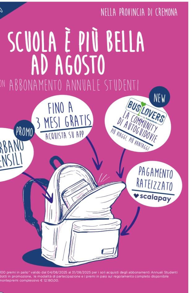 Attivata un’importante promozione che va incontro alle famiglie delle aree di Crema e Cremona: i primi 100 che acquisteranno da App Autoguidovie fino al 31 agosto un abbonamento annuale under 20, avranno diritto a un mese di viaggi gratis, che potrà essere utilizzato da