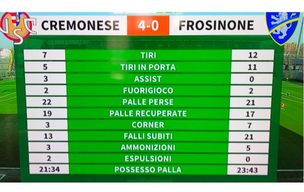 Il secondo tempo vede la Cremonese dilagare con Baez e Ciofani, per poi controllare la partita senza correre troppi pericoli e fallendo in un paio di occasioni l’occasione del 5-0.