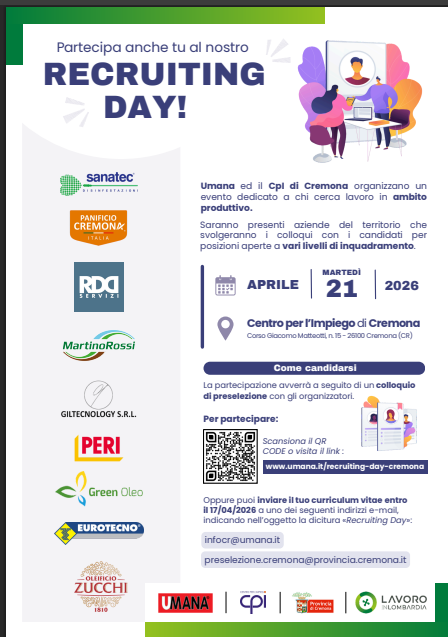 Il Centro per l’Impiego di Cremona, in collaborazione con l’agenzia per il lavoro Umana, organizza un Recruiting Day con l’obiettivo di favorire l’incontro tra nove importanti realtà produttive del territorio cremonese e persone in cerca di occupazione nel settore produttivo.