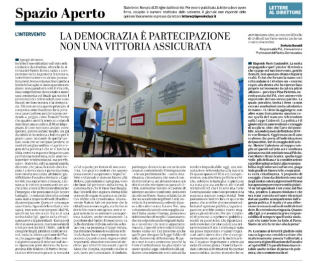 ho letto il suo editoriale sull’esito referendario e da cittadina, oltre che da attivista del Partito Democraticoe componente della Segreteria Nazionale,vorrei intervenire con alcune puntualizzazioni.