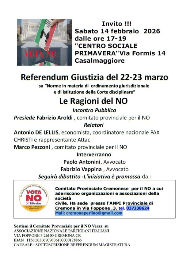 Sabato 14 febbraio 2026 dalle ore 17-19 "CENTRO SOCIALE PRIMAVERA"Via Formis 14 Casalmaggiore Referendum Giustizia del 22-23 marzo