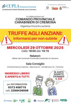 Mercoledì 29 Ottobre 2025 Anziani CUPLA Cremona segnala incontro contro le truffe agli anziani A seguire terremo a Crema, Casalmaggiore e Soresina sarà svolto in collaborazione con il Comando Carabinieri di Cremona.