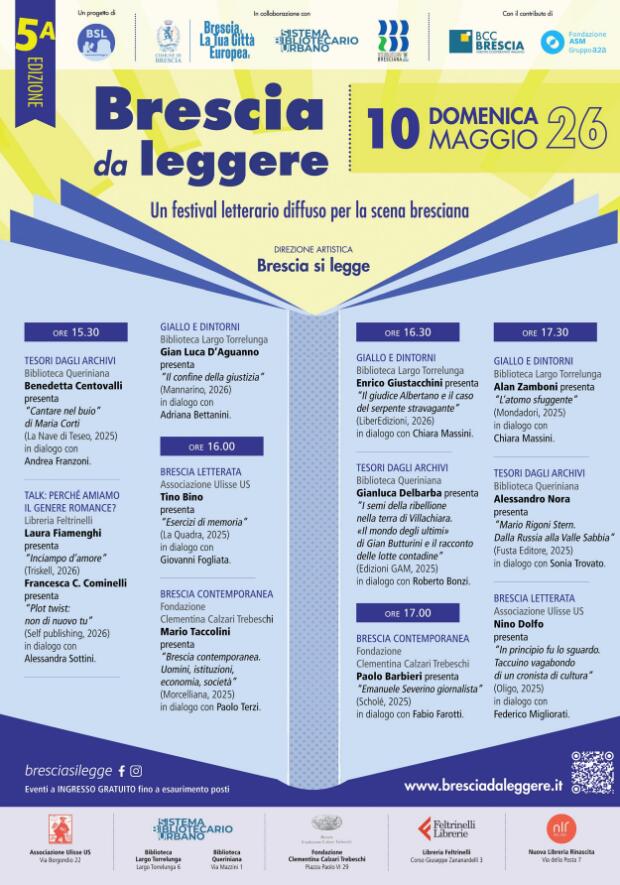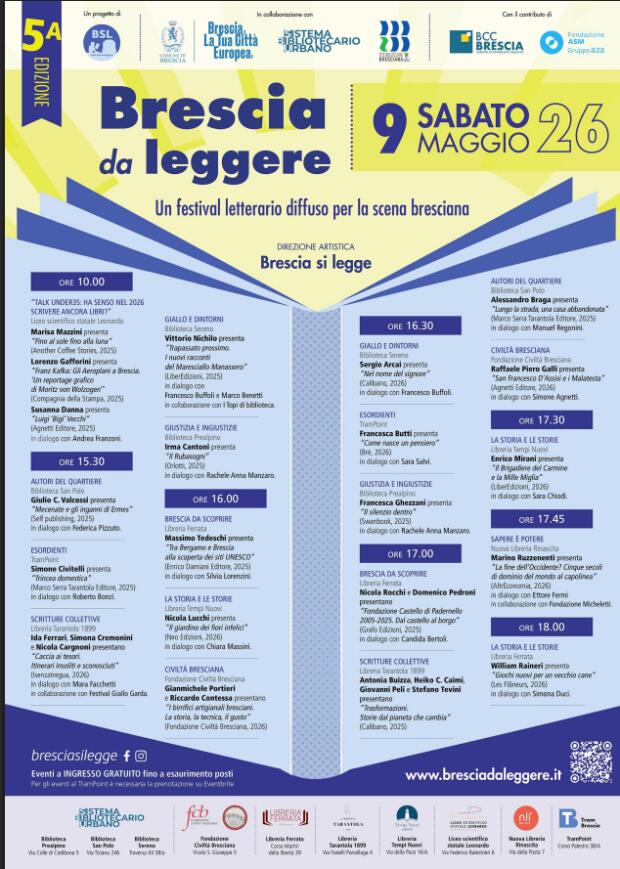 Oltre 30 libri di recente pubblicazione, profondamente legati a Brescia e alla sua provincia e selezionati da una direzione artistica diffusa, saranno presentati in 15 tra biblioteche, librerie e istituzioni culturali con il duplice obiettivo di raccontare passato, presente e futuro del nostro territorio, e di valorizzare la scena letteraria locale