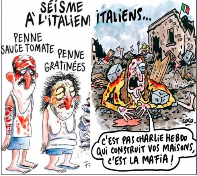 Secondo quanto espongono nella querela i legali del Comune di Amatrice il periodico francese Charlie Hebdo aveva raffigurato le vittime del sisma «in modo tale da somigliare a degli stereotipati piatti della tradizione culinaria italiana», mentre una seconda vignetta «aveva attribuito la colpa della devastazione del centro Italia alla mafia.