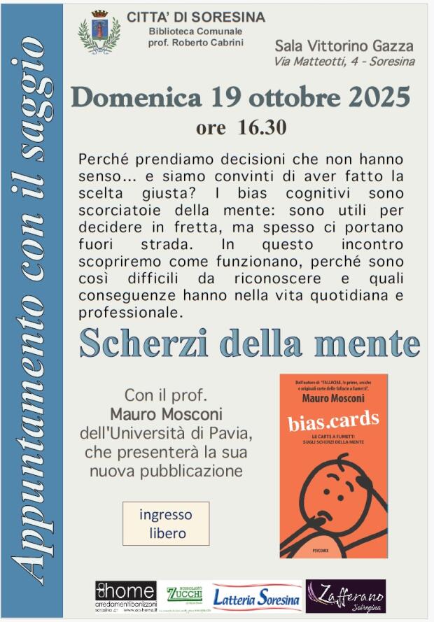 L’evento si terrà Domenica 19 ottobre alle ore 16.30 nella Sala Gazza di Via Matteotti, 6 in Soresina dove il prof. Mauro Mosconi dell’università di Pavia intratterrà il pubblico con Scherzi della mente. Perché prendiamo decisioni che non hanno senso… e siamo convinti di aver fatto la scelta giusta? I bias cognitivi sono scorciatoie della mente.