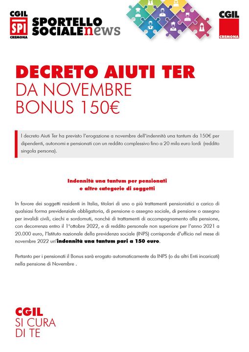 Spi Cgil Cremona Decreto Aiuti Ter Da novembre bonus 150 euro