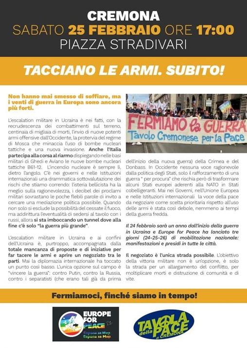 EUROPE FOR PEACE CREMONA PIAZZA STRADIVARI 25 febbraio ore 17