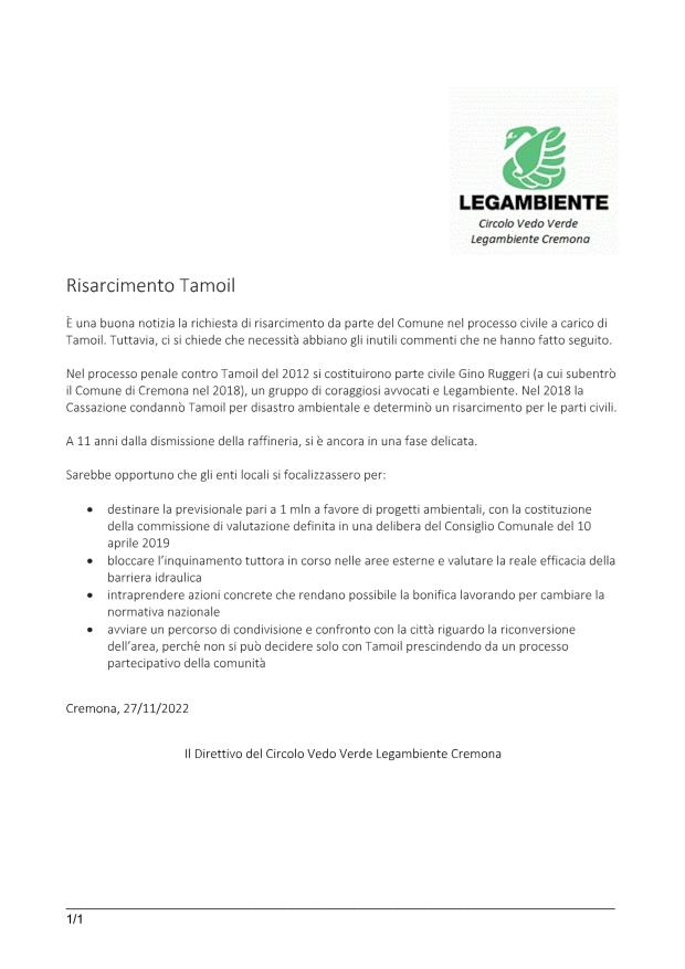 Tamoil A 11 anni dismissione raffineria la fase è ancora delicata| Lega Ambiente (CR)