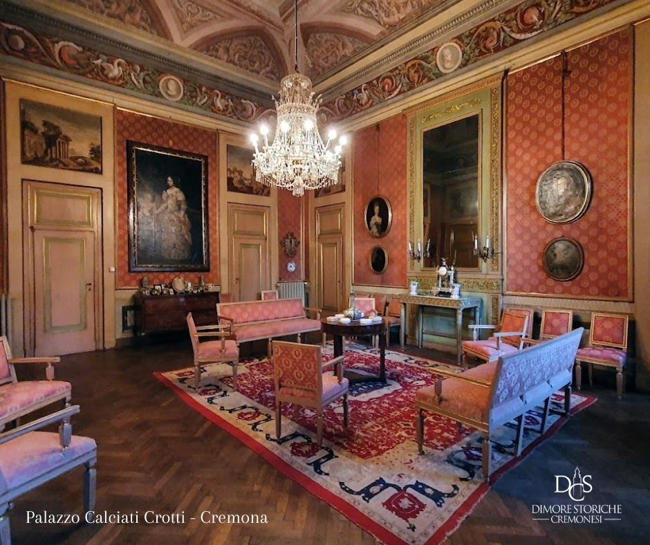 Cremona, Via Palestro 1 Antica dimora nobiliare sorta tra il 1763 e il 1766 su commissione del nobile Conte Cesare Crotti per celebrare l'importanza del casato cremonese. All'interno il monumentale scalone d'onore conduce negli appartamenti nobili, affrescati e decorati con magnificenza da artisti cremonesi del Settecento; un tripudio di arredi antichi, opere d'arte, cimeli di famiglia appartenuti ai casati Crotti e Calciati e tramandati per generazioni sino ad oggi.