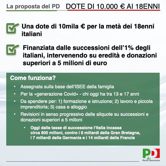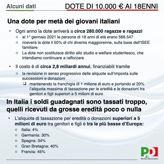 Con “dote 18” proponiamo che l'1% degli italiani che eredita patrimoni sopra i 5 milioni di euro finanzi il diritto al futuro di 280.000 ragazze e ragazzi ogni anno. E' una proposta del Partito Democratico per l'#equità e per la #giustiziasociale”.