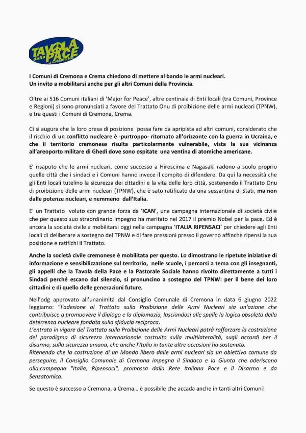 Considerata l’assenza dell’Italia da questa importante Conferenza, la campagna “Italia ripensaci” intensifica la sua pressione presso i Comuni affinchè deliberino in favore del Trattato Onu e sollecitino Parlamento e Governo a rivedere la propria astensione. A tal scopo, sono esemplari le prese di posizione dei Comuni di Cremona e di Crema che meritano di essere rilanciate e fatte conoscere perché fanno da apripista e possono essere imitate da altri Comuni del territorio.