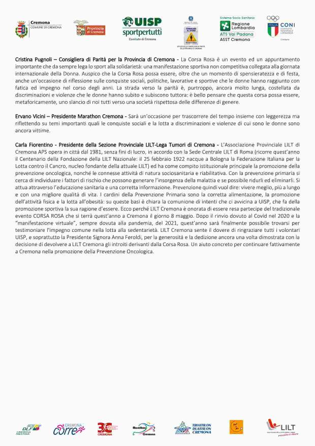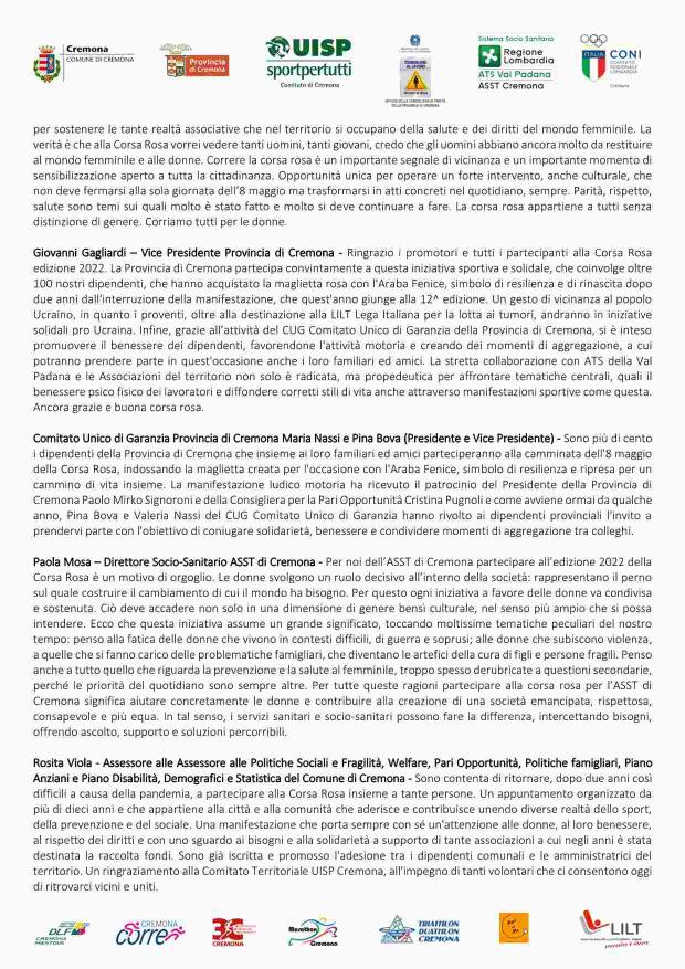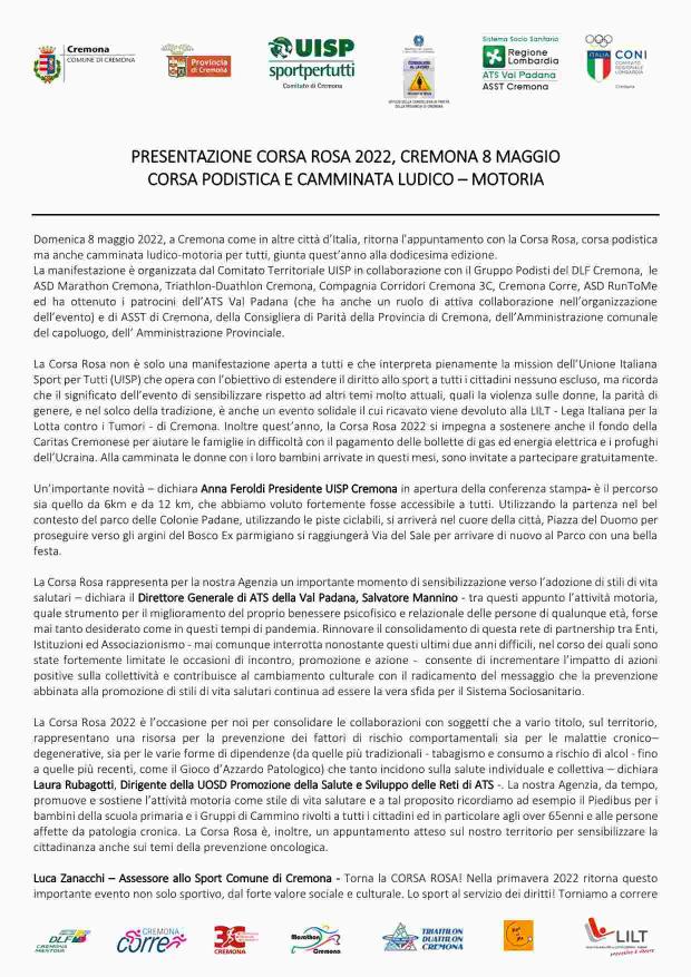 UISP PRESENTAZIONE CORSA ROSA 2022, CREMONA 8 MAGGIO CORSA PODISTICA