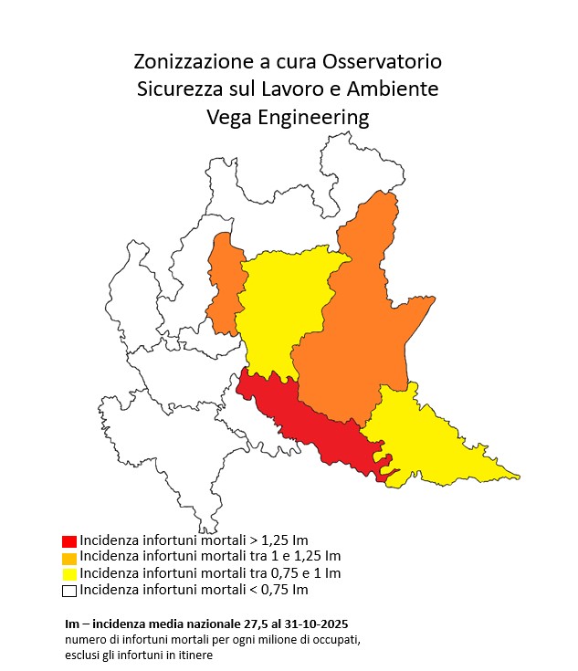 La zona bianca, in cui si trova la Lombardia, è quella che raggruppa le regioni con l’incidenza di mortalità sul lavoro più bassa a livello nazionale. A fine ottobre 2025, dunque, il rischio di infortunio mortale in Lombardia (19 morti per milione di occupati) risulta essere molto al di sotto della media nazionale pari a 27,5.