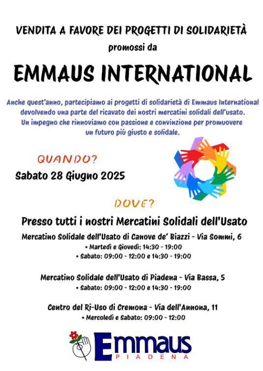 Allo scopo di sostenere queste azioni, una parte dell'incasso dei mercatini solidali Emmaus di sabato 28 giugno verrà destinata a Emmaus Internazionale. I mercatini Emmaus si trovano a Canove de' Biazzi (Torre de' Picenardi), Piadena e al Centro del Riuso di Cremona (via dell'Annona, 11). Sabato saranno aperti dalle 9 alle 12 e dalle 14:30 alle 19, tranne il Centro del Riuso che sarà aperto solo al mattino.